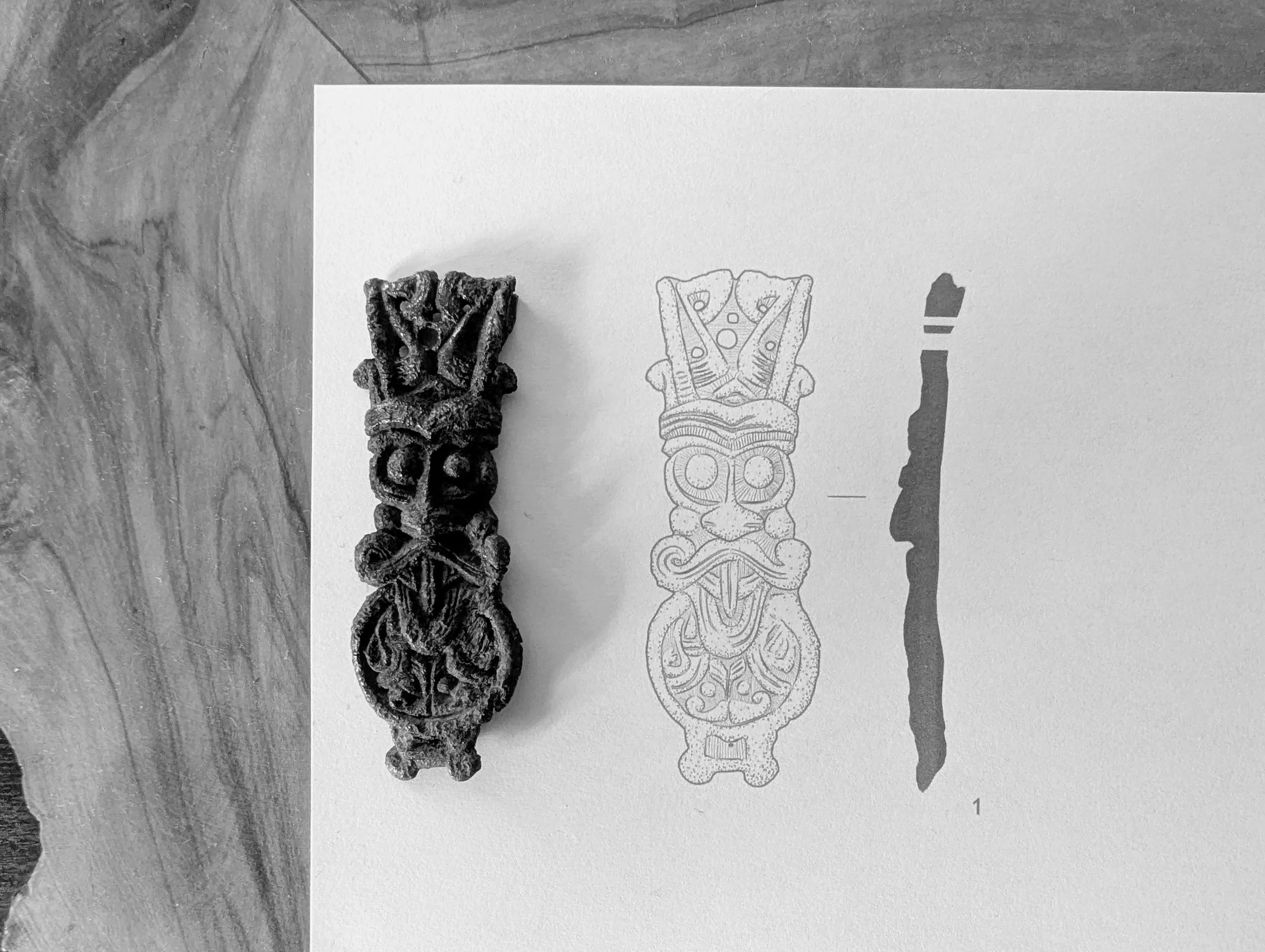 Comparison of a copper-alloy anthropomorphic fitting with its technical illustration, demonstrating the accuracy and clarity achieved in publication-ready finds drawings.